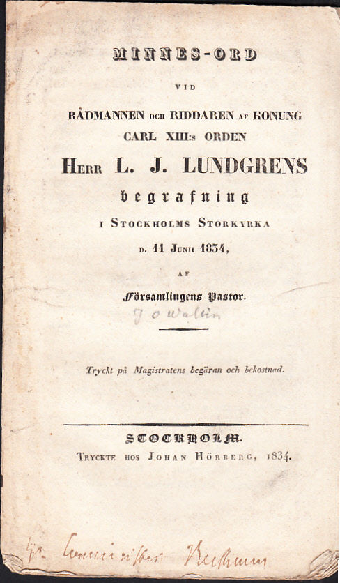 Minnes-ord vid rådmannen och riddaren af konung Carl XIII:s orden herr L. J. Lundgrens begrafning i Stockholms storkyrka d. 11 junii 1834, af församlingens pastor. Tryckt på magistratens begäran och bekostnad.
