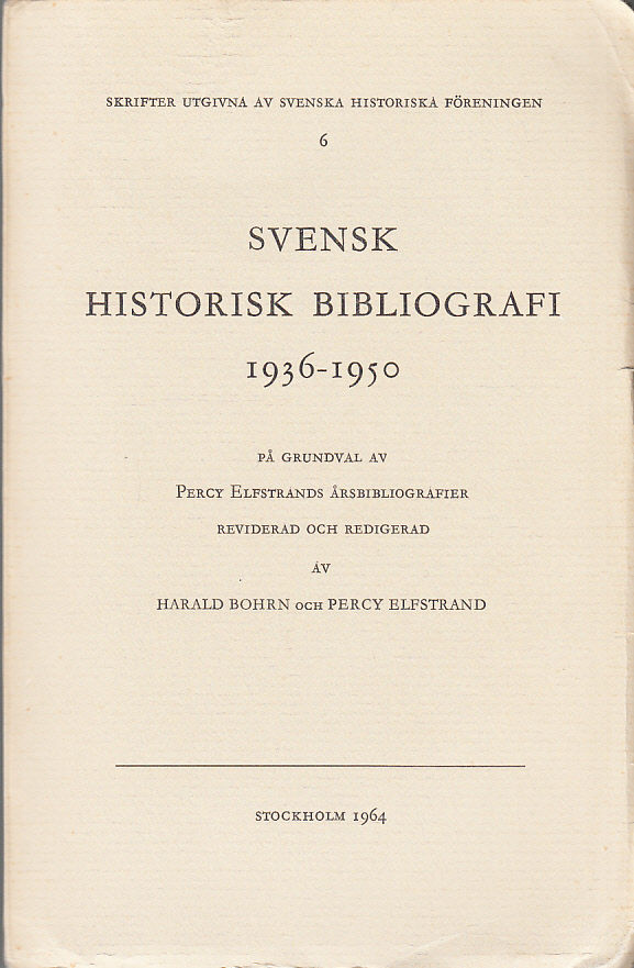 Svensk historisk bibliografi 1936-1950. Systematisk förteckning över skrifter och uppsatser som röra Sveriges historia utkomna från och med 1936 till och med 1950. På grundval av Percy Elfstrands årsbibliografier reviderad och redigerad av Harald Bohrn och Percy Elfstrand.
