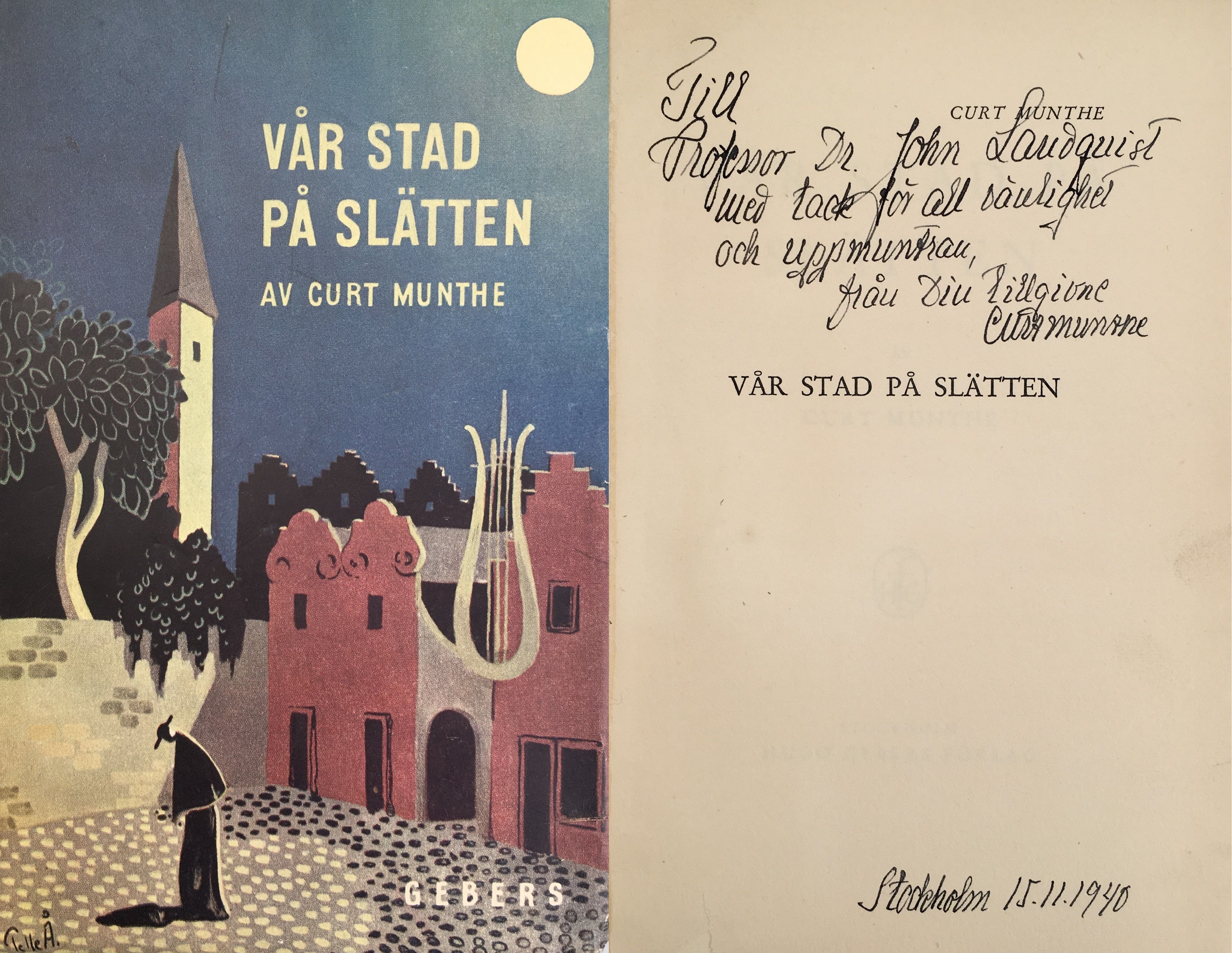Uppsala, Almqvist & Wiksells Boktryckeri-A.-B., 1940. 8:o. 246 s. Trådhäftad med styvt tryckt illustrerat pappersomslag. Något snedläst. Tillskrift ‘Till Professor Dr. John Landquist med tack för all vänlighet och uppmuntran, från din tillgivne Curt Munthe. Stockholm 15.11.1940’ på halvtitelbladet.