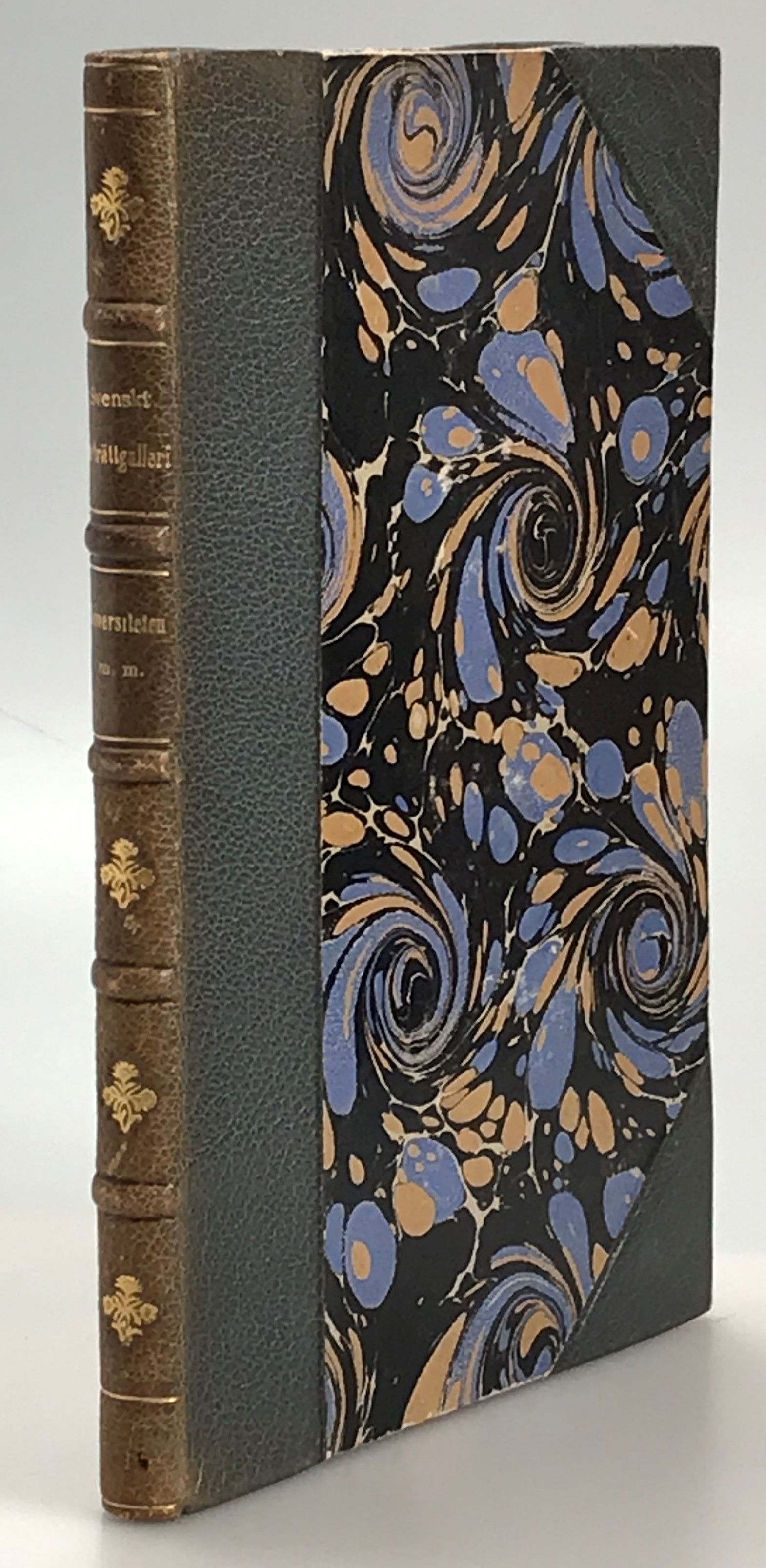 Stockholm, Hasse W. Tullbergs Boktryckeri, 1896. 8:o. (5), 103 s. Rikt illustrerad. Gråblått halvskinnband med fem upphöjda bind, ryggtitel & -dekor i guld. Oljemarmorerat pärmpapper samt övre guldsnitt. Båda häftesomslagen medbundna. Solbränd rygg. Exlibris ‘Carl Asp’ på främre pärmens insida.