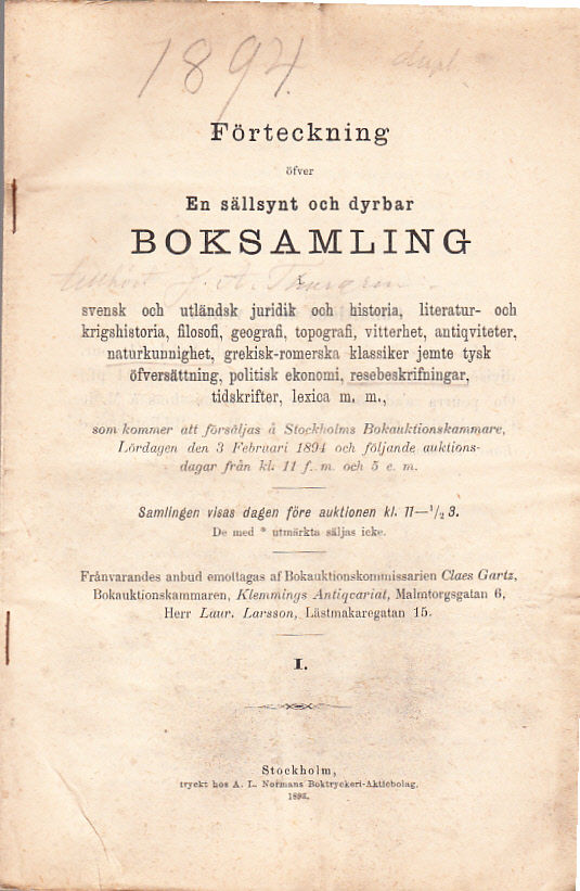 Förteckning öfver en sällsynt och dyrbar boksamling svensk och utländsk juridik och historia, literatur- och krigshistoria, filosofi, geografi, topografi, vitterhet, antiqviteter, naturkunnighet, grekisk-romerska klassiker jemte tysk öfversättning, politisk ekonomi, resebeskrifningar, tidskrifter, lexica m.m., som kommer att försäljas å Stockholms Bokauktionskammare, Lördagen den 3 februari 1894 ... I.