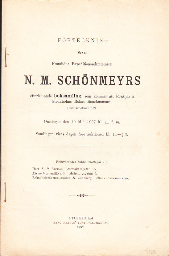 Förteckning öfver framlidne expeditionssekreteraren N.M. Schönmeyers efterlemnade boksamling, som kommer att försäljas å Stockholms Bokauktionskammare (Riddarholmen 12) Onsdagen den 19 maj 1897 ...