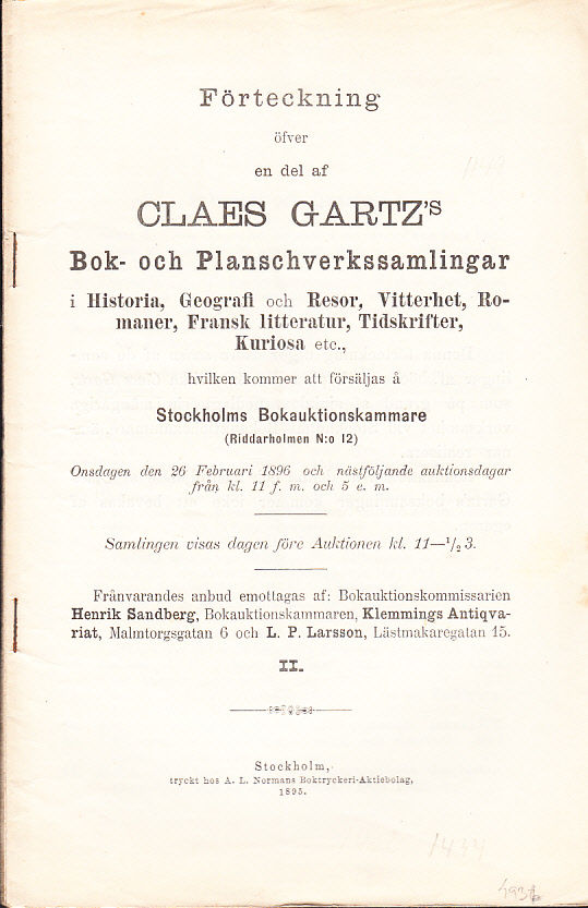 Förteckning öfver en del af Claes Gartz’s bok- och planschverkssamlingar i Historia, Geografi och Resor, Vitterhet, Romaner, Fransk litteratur, Tidskrifter, Kuriosa etc., hvilken kommer att försäljas å Stockholms Bokauktionskammare (Riddarholmen N:o 12). Onsdagen den 26 februari och nästföljande auktionsdagar ... II.