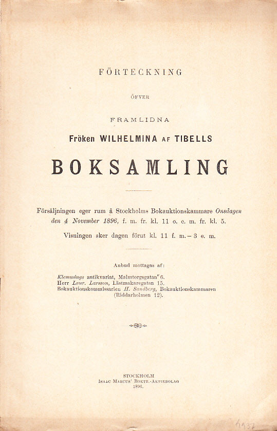 Förteckning öfver framlidna fröken Wilhelmina af Tibells boksamling. Försäljningen eger rum å Stockholms Bokauktionskammare Onsdagen den 4 november 1896 ...