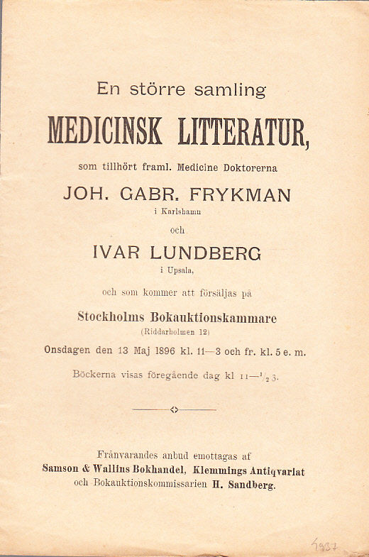 En större samling medicinsk litteratur, som tillhört framl. medicine doktorerna Joh. Gabr. Frykman i Karlshamn och Ivar Lundberg i Upsala, och som kommer att försäljas på Stockholms Bokauktionskammare (Riddarholmen 12) Onsdagen den 13 maj 1896 ...