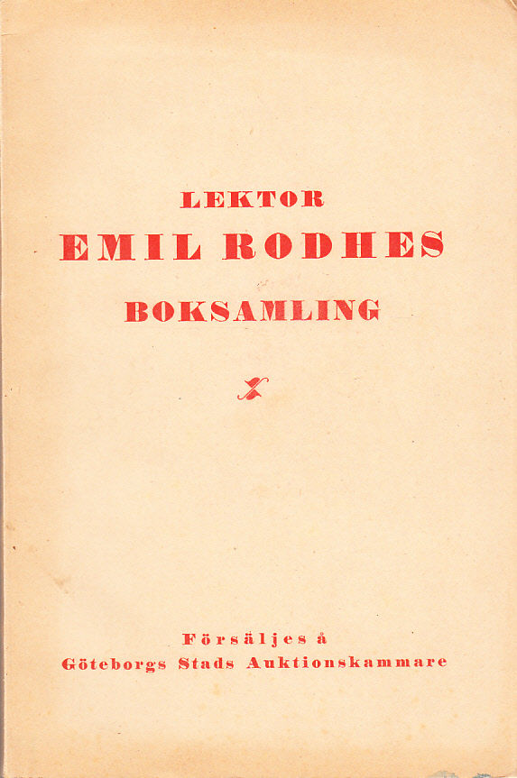 Förteckning över större delen av lektor Emil Rodhes boksamling som kommer att försäljas å Göteborgs Stads Auktionskammare med början måndagen den 9 nov. 1936 ...