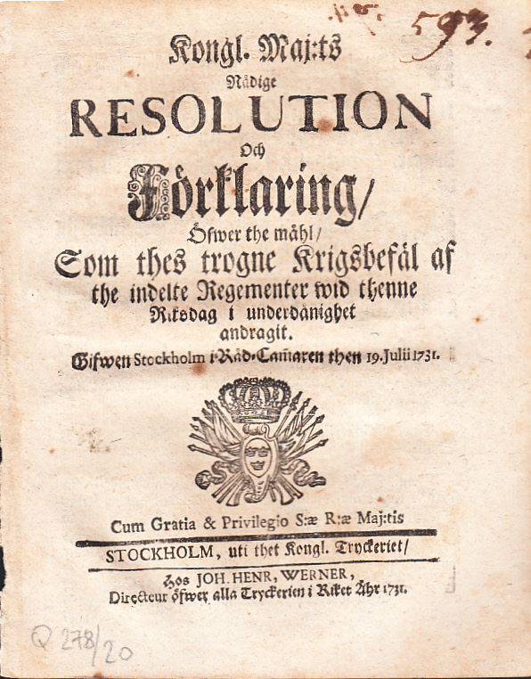 Kongl. maj:ts nådige resolution och förklaring, öfwer the måhl, som thes trogne krigsbefäl af the indelte regementer wid thenne riksdag i underdånighet andragit. Gifwen Stockholm i råd-camaren then 19. julii [!,=junii) 1731.