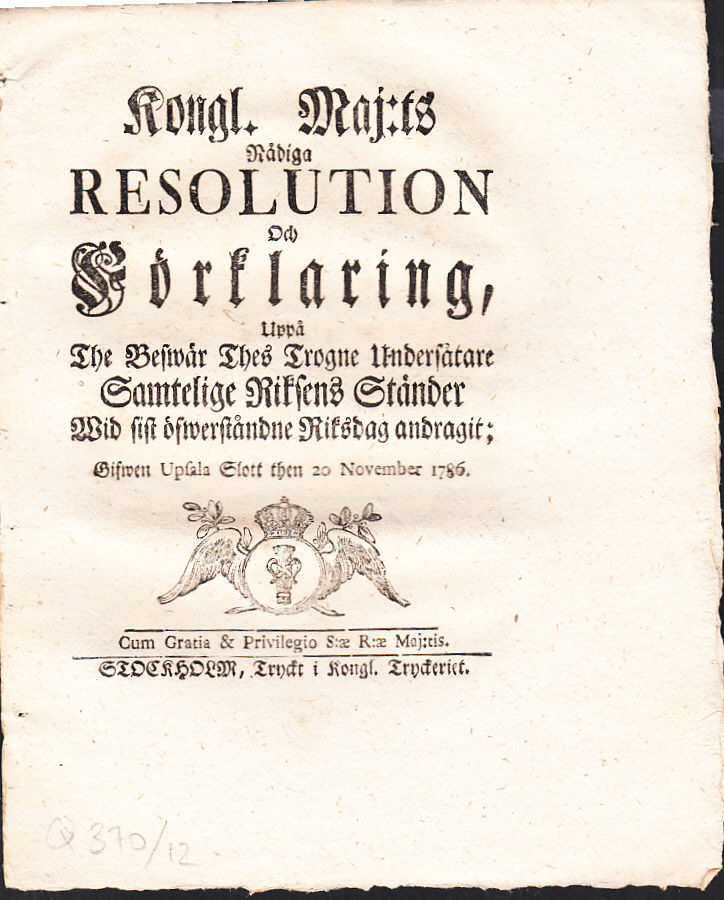 Kongl. maj:ts nådiga resolution och förklaring, uppå the beswär thes trogne undersåtare samtelige riksens ständer wid sist öfwerståndne riksdag andragit; gifwen Upsala slott then 20 november 1786.