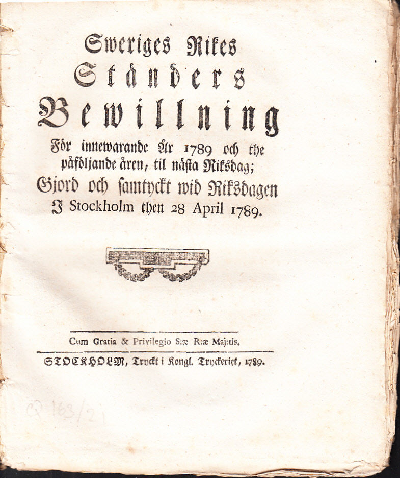 Sweriges rikes ständers bewillning för innewarande år 1789 och the påföljande åren, til nästa riksdag; gjord och samtyckt wid riksdagen i Stockholm then 28 april 1789.