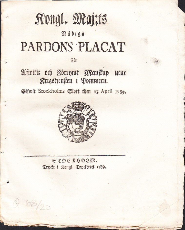 Kongl. Maj:ts Nådiga Pardons Placat För Afwikit och Förrymt Manskap utur Krigstjensten i Pommern. Gifwit Stockholms Slott then 23 April 1789.