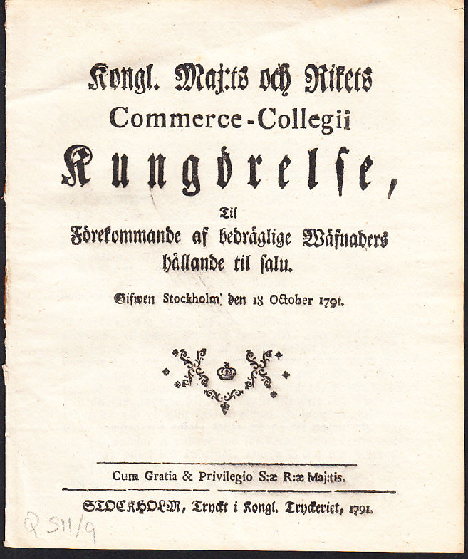 Kongl. maj:ts och Rikets Commerce-Collegii Kungörelse, Til Förekommande af bedräglige Wäfnaders hållande til salu. Gifwen Stockholm then 18 october 1791.