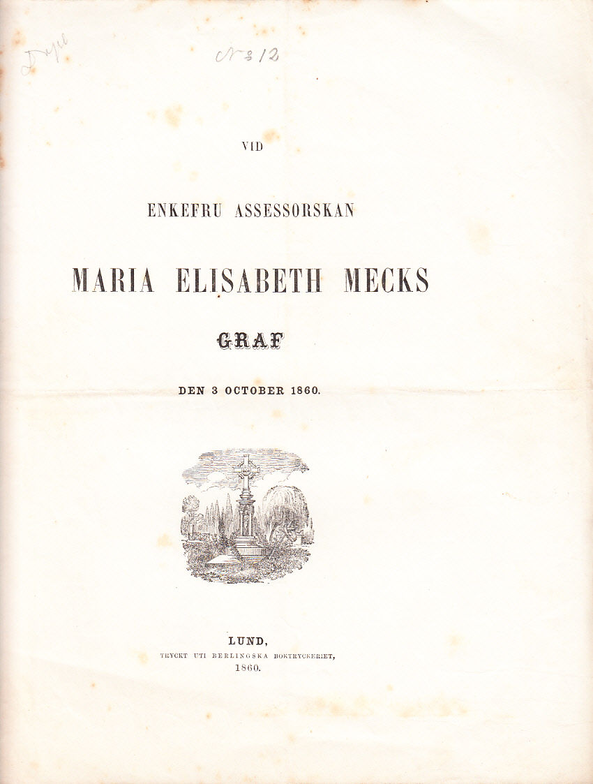 Vid enkefru assessorskan Maria Elisabeth Mecks graf den 3 october 1860.