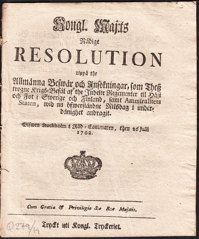 Kongl. maj:ts nådige resolution uppå the allmänna beswär och ansökningar, som thesz trogne krigs-befäl af the indelte regementer til häst och fot i Swerige och Finland, samt ammiralitets staten, wid nu öfwerståndne riksdag i underdånighet andragit. Gifwen Stockholm i råd-cammaren, then 26 julii 1762.