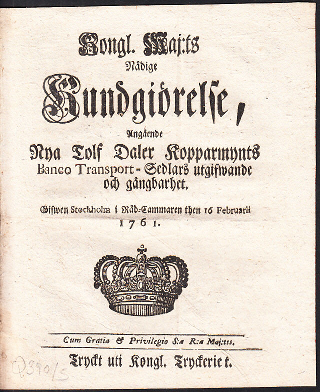 Kongl. Maj:ts Nådige Kundgiörelse, Angående Nya Tolf Daler Kopparmynts Banco Transport-Sedlars utgifwande och gångbarhet. Gifwen Stockholm i Råd-Cammaren then 16 Februarii 1761.