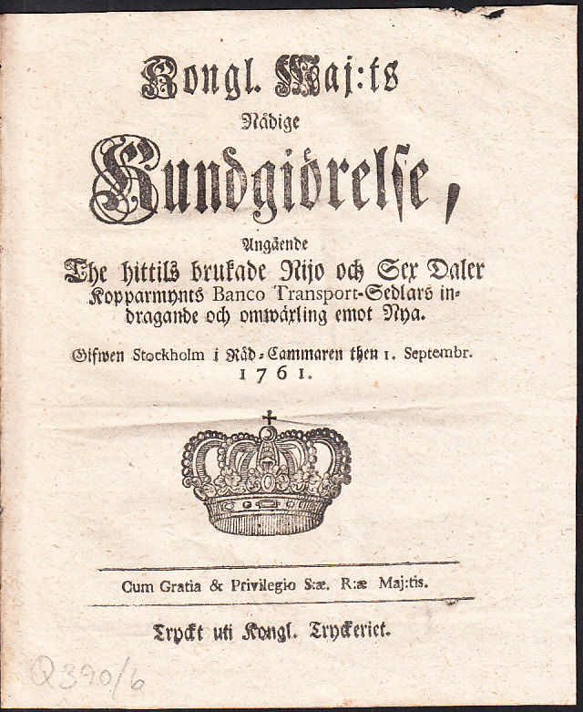 Kongl. Maj:ts Nådige Kundgiörelse, Angående The hittils brukade Nijo och Sex Daler Kopparmynts Banco Transport-Sedlars indragande och omwäxling emot Nya. Gifwen Stockholm i Råd-Cammaren then 1. Septembr. 1761.