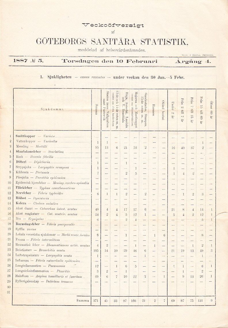Aberstén ‘Bibliographia Gothoburgensis’ 1201. 1887. No 5, Årgång 4. Torsdagen den 10 februari. Omfattar: Sjuklighet under veckan den 30 jan. - 5 febr.; Dödlighet under veckan den 30 jan. - 5 febr.; Jemförelse mellan de sistförflutna 10 veckorna [4 dec. - 5 febr.]; Väderleken [under veckan den 30 jan. - 5 febr.].