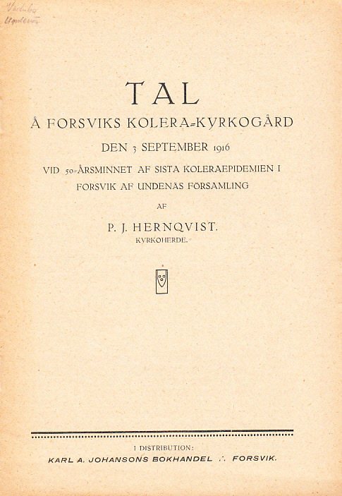 Tal å Forsviks kolera-kyrkogård den 3 september 1916 vid 50-årsminnet af sista koleraepidemien i Forsvik af Undenäs församling af P.J. Hernqvist ...