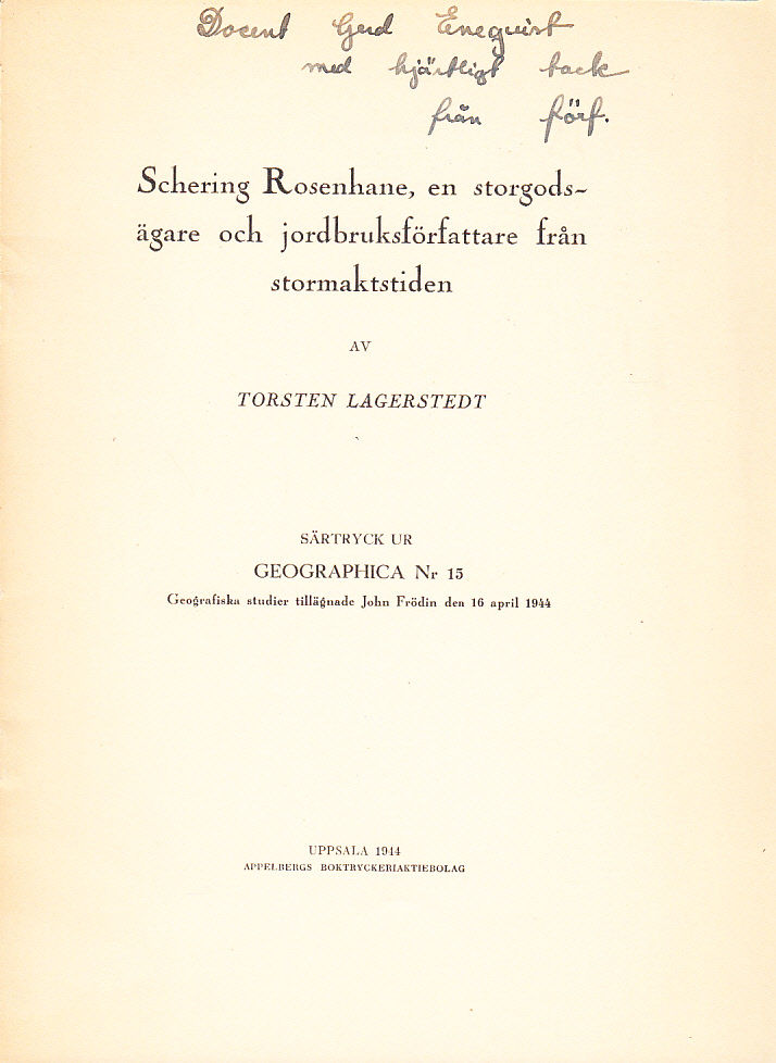 Uppsala, Appelbergs Boktryckeriaktiebolag, 1944. Stor 8:o. s. [388]-399. Klammerhäftad med styvt tryckt pappersomslag. Aningen solblekt rygg. Tillskrift ‘Docent Gerd Enequist / med hjärtligt tack / från förf.’ på främre omslag.