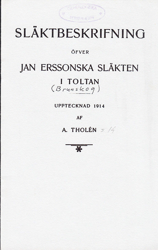 Släktbeskrifning öfver Jan Erssonska släkten i Toltan. Upptecknad 1914. Faksimiltryck efter upplaga tryckt 1914. [Utg. av] Brunskogs hembygdsförening.