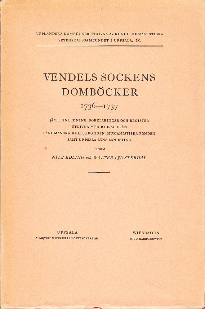 Vendels sockens domböcker 1736-1737 jämte inledning, förklaringar och register utgivna ... genom Nils Edling och Walter Ljusterdal.