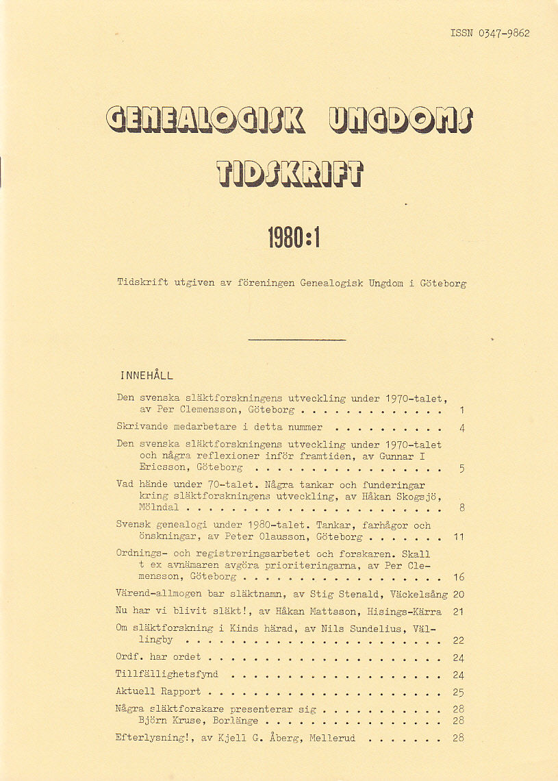 Genealogisk Ungdoms Tidskrift 1980:1-4. (Årg. 4). Tidskrift utgiven av föreningen Genealogisk Ungdom i Göteborg. [Red.: Håkan Skogsjö].