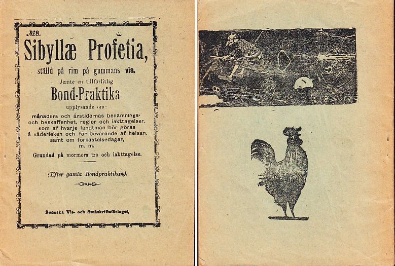 Sibyllæ profetia, ställd på rim på gummans vis. Jemte en tillförlitlig Bond-praktika upplysande om: månaders och årstidernas benämningar och beskaffenhet, regler och iakttagelser, som af hvarje landtman bör göras å väderleken och för bevarande af helsan, samt om förkastelsedagar, m.m. Grundad på mormors tro och iakttagelser. (Efter gamla Bondpraktikan). [Utg. av] Svenska Vis- och Småskriftsförlaget.