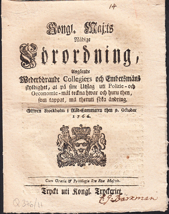 [Stockholm], Tryckt uti Kongl. Tryckeriet, [1766]. 4:o. (4) s. Med graverad titelvinjett. Tagen ur band, med råkanter. Namnteckning ‘C.G. Barkman’ vid nedre marginal.