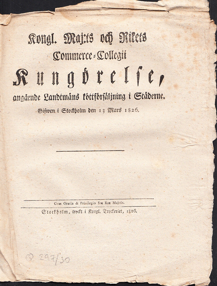 Kongl. maj:ts och Rikets Commerce-collegii Kungörelse, angående Landtmäns köttförsäljning i Städerne. Gifwen i Stockholm den 13 mars 1826.