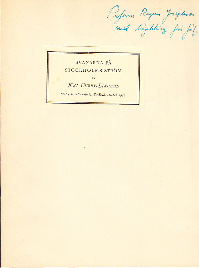 Stockholm, Kungl. Boktr. P.A. Norstedt & Söner, 1957. 8:o. s. [15]-26. Illustrerad. Klammerhäftad med styvt tryckt pappersomslag. Tillskrift ‘Professor Ragnar Josephson / med högaktning från förf.’ på främre omslag.