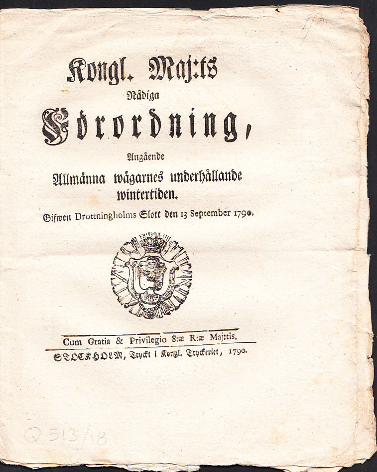 Kongl. Maj:ts Nådiga Förordning, Angående Allmänna wägarnes underhållande wintertiden. Gifwen Drottningholms Slott den 13 September 1790.