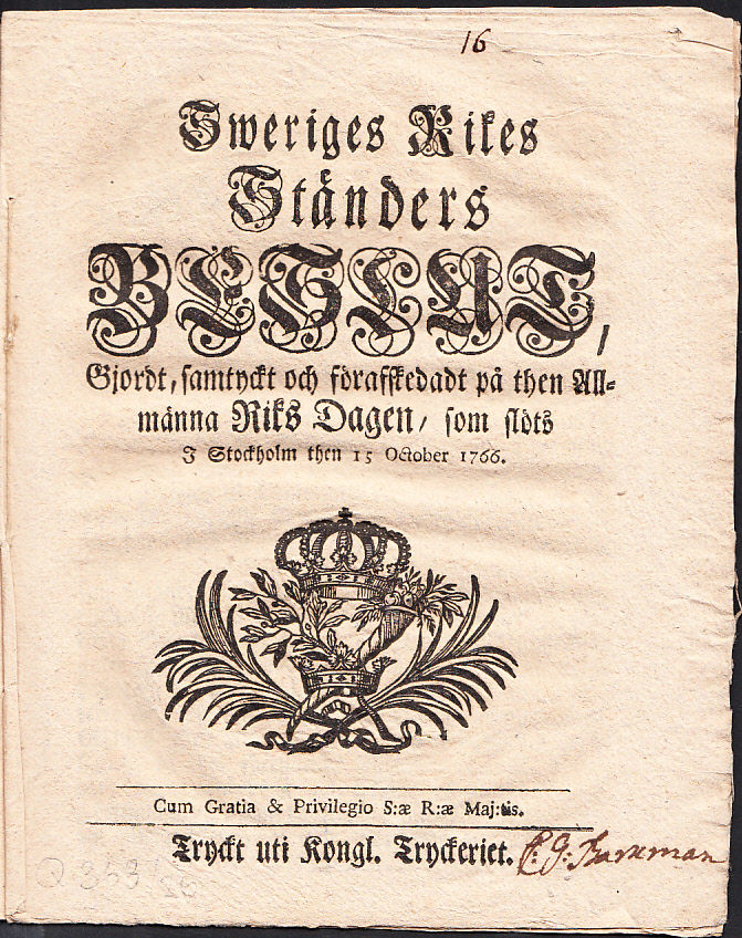 Sweriges rikes ständers beslut, gjordt, samtyckt och förafskedadt på then allmänna riks dagen, som slöts i Stockholm then 15 october 1766.