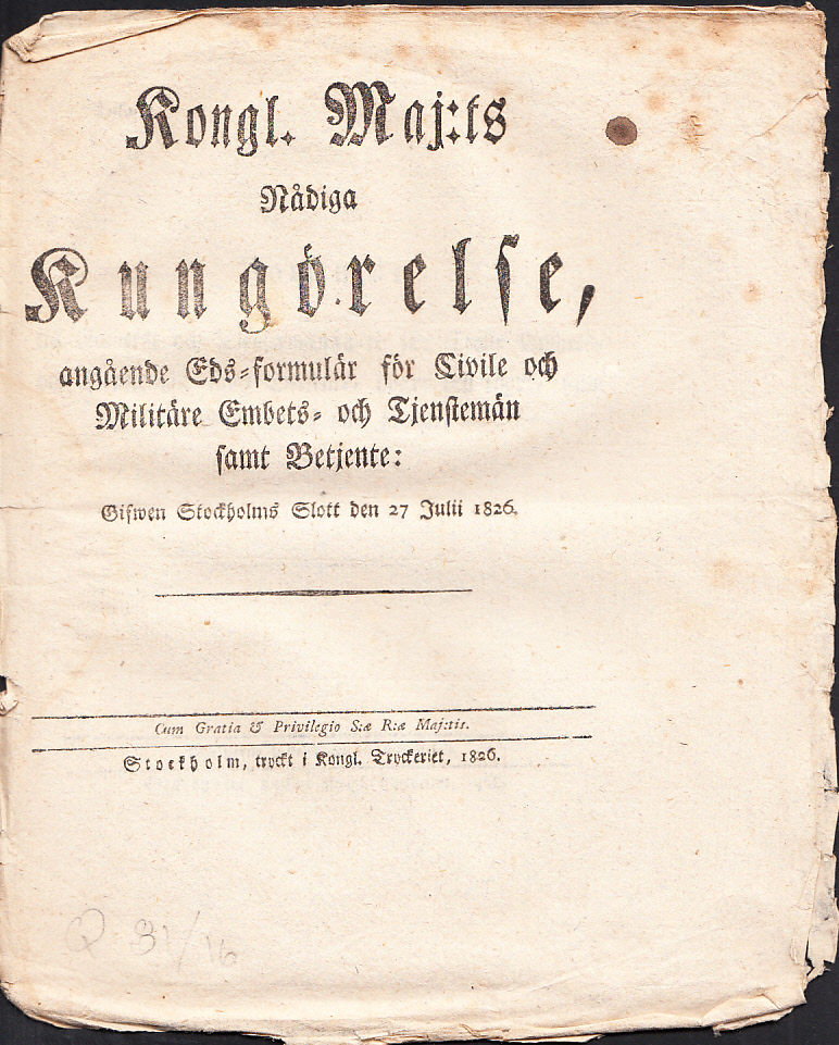 Kongl. maj:ts nådiga Kungörelse, angående Eds-formulär för Civile och Militäre Embets- och Tjenstemän samt Betjente: Gifwen Stockholms slott den 27 julii 1826.