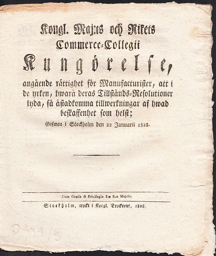 Kongl. maj:ts och Rikets Commerce-collegii Kungörelse, angående rättighet för Manufacturister, att i de yrken, hwarå deras Tillstånds-Resolutioner lyda, få åstadkomma tillwerkningar af hwad beskaffenhet som helst; Gifwen i Stockholm den 22 januarii 1828.