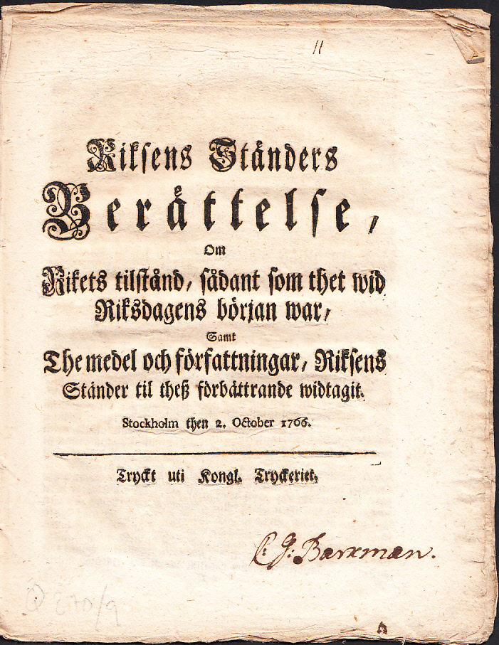 Riksens ständers berättelse, om rikets tilstånd, sådant som thet wid riksdagens början war, samt the medel och författningar, riksens ständer til thesz förbättrande widtagit. Stockholm then 2. october 1766.