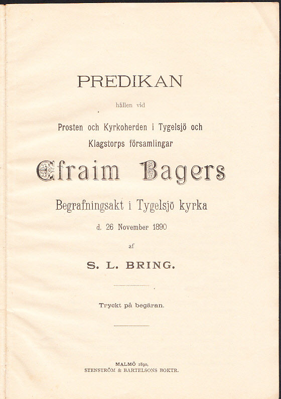 Predikan hållen vid prosten och kyrkoherden i Tygelsjö och Klagstorps församlingar, Efraim Bagers begrafningsakt i Tygelsjö kyrka d. 26 november 1890 af S.L. Bring. Tryckt på begäran.