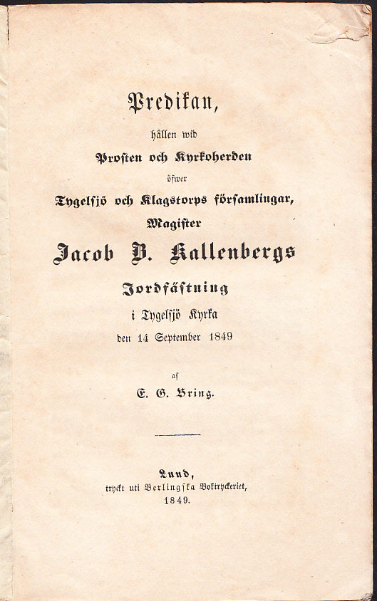 Predikan, hållen wid prosten och kyrkoherden öfwer Tygelsjö och Klagstorps församlingar, magister Jacob B. Kallenbergs jordfästning i Tygelsjö kyrka den 14 september 1849 af E. G. Bring.