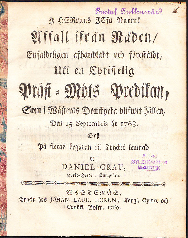 Affall ifrån nåden, enfaldeligen afhandladt och förestäldt, uti en christelig präst-möts predikan, som i Wästerås domkyrka blifwit hållen, den 15 septembris år 1768, och på fleras begäran til trycket lemnad af Daniel Grau ...