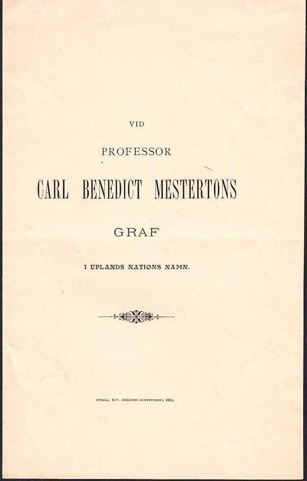 Upsala, Ed. Berlings Boktryckeri, 1889. 8:o. (4) s. Vikt lätt nött ark. Antydan till tvärgående vikmärke.