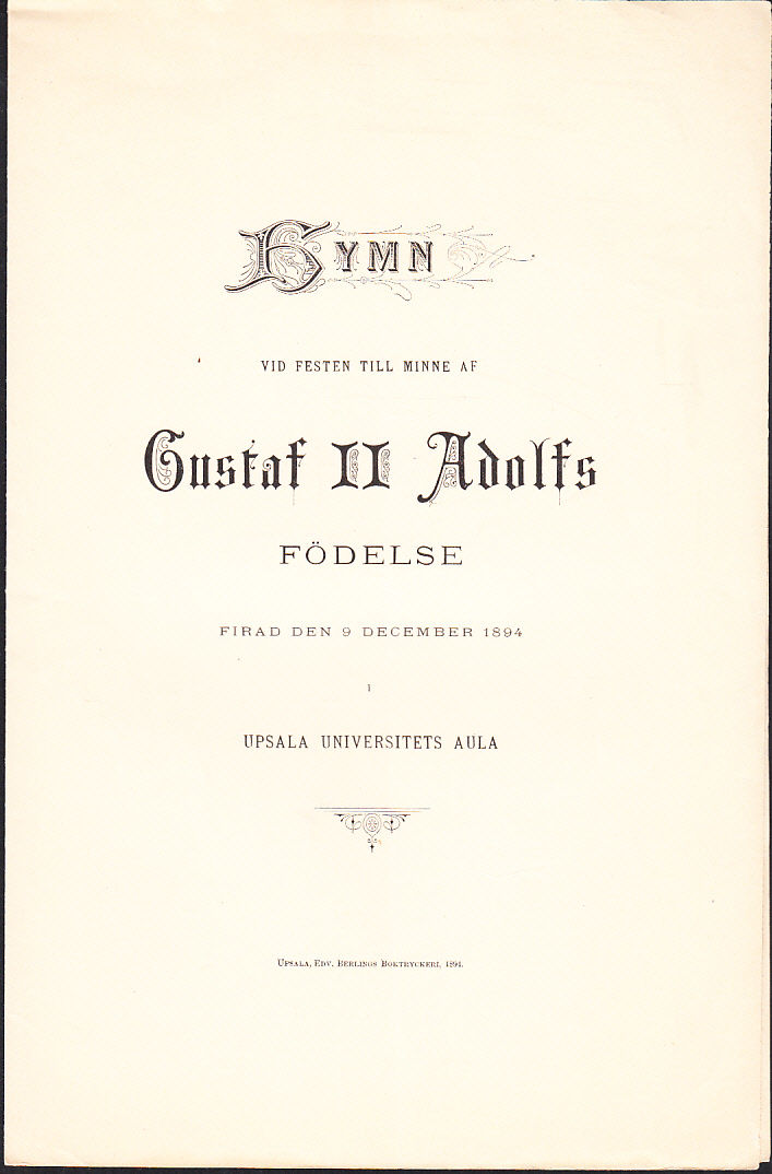 Upsala, Edv. Berlings Boktryckeri, 1894. 8:o. (4) s. Vikt lätt nött ark. Antydan till längsgående vikmärke. Sista sidan lätt solkad.