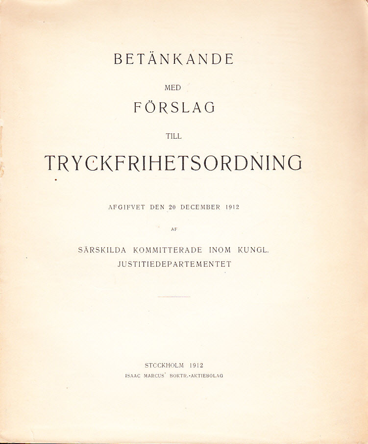 Betänkande med förslag till tryckfrihetsförordning afgifvet den 20 december 1912 af Särskilda kommitterade inom Kungl. Justitiedepartementet.