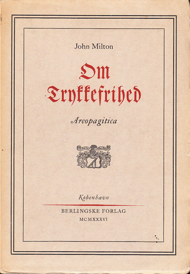Om trykkefrihed. Areopagitica. Oversat og med indledning af A.C. Krebs. [Utg. av] Berlingske Forlag.