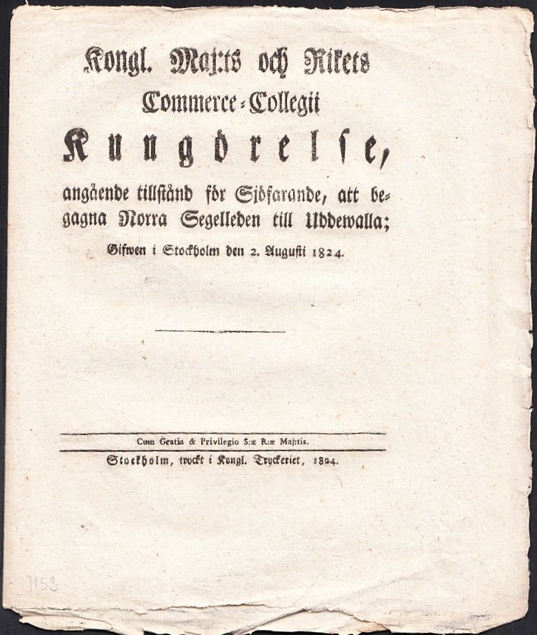 Kongl. Maj:ts och Rikets Commerce-Collegii Kungörelse, angående tillstånd för Sjöfarande, att begagna Norra Segelleden till Uddewalla; Gifwen i Stockholm den 2. Augusti 1824.