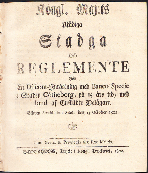 Kongl. Maj:ts Nådiga Stadga Och Reglemente För En Discont-Inrättning med Banco Specie i Staden Götheborg, på 15 års tid, med fond af Enskildte Delägare. Gifwen Stockholms Slott den 13 October 1802.