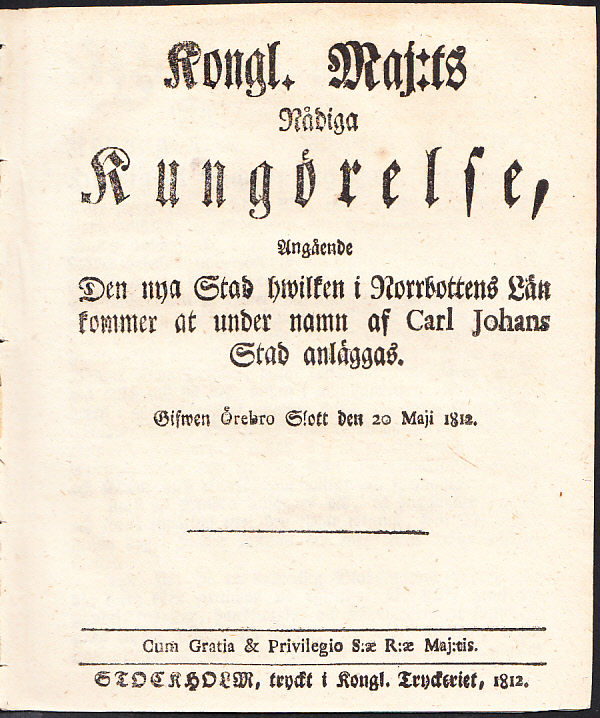 Kongl. Maj:ts Nådiga Kungörelse, Angående Den nya Stad hwilken i Norrbottens Län kommer at under namn af Carl Johans Stad anläggas. Gifwen Örebro Slott den 20 Maji 1812.