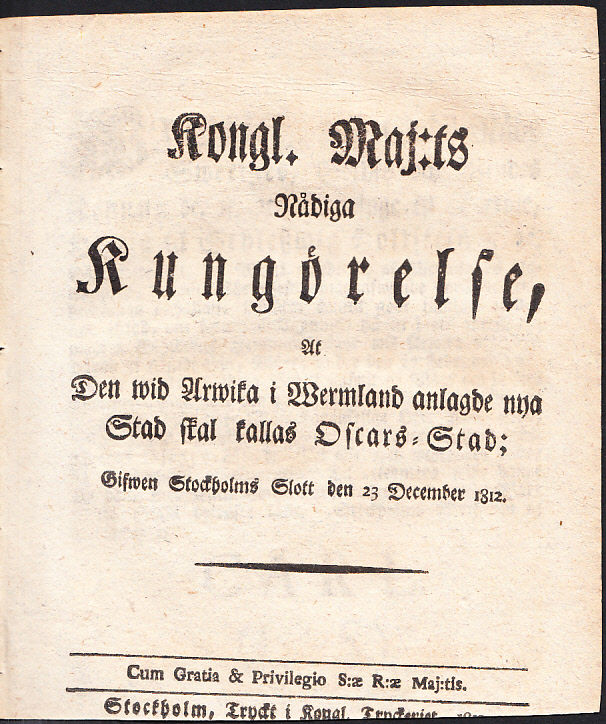 Kongl. Maj:ts Nådiga Kungörelse, At Den wid Arwika i Wermland anlagde nya Stad skal kallas Oscars-Stad; Gifwen Stockholms Slott den 23 December 1812.