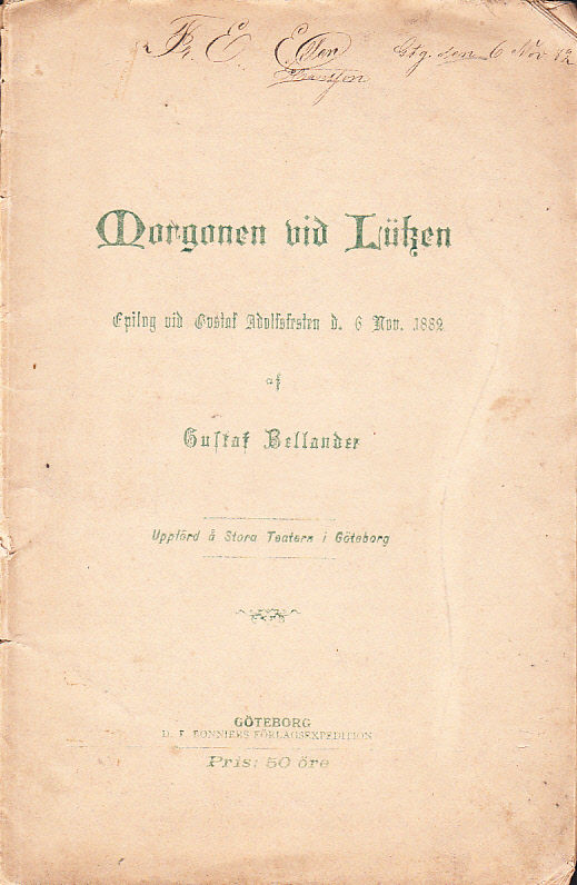 Morgonen vid Lützen. Epilog vid Gustaf Adolfsfesten d. 6 nov. 1882. Uppförd å Stora Teatern i Göteborg.
