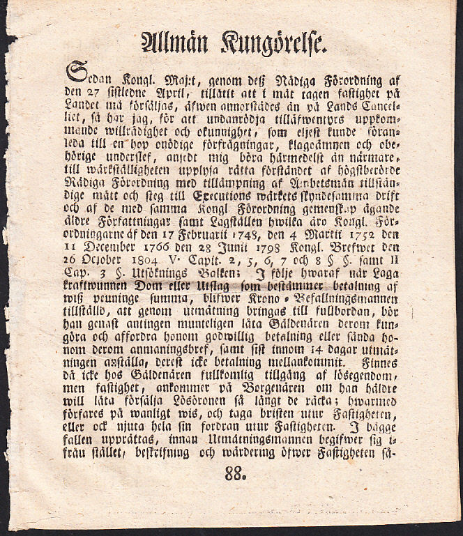 Linköping, Groth och Petre, [1810]. 4:o. (8) s. Tagen ur band. Rättelse på s. (7), ‘auctionen’ överstruket och ersatt med ‘utmätningen’.