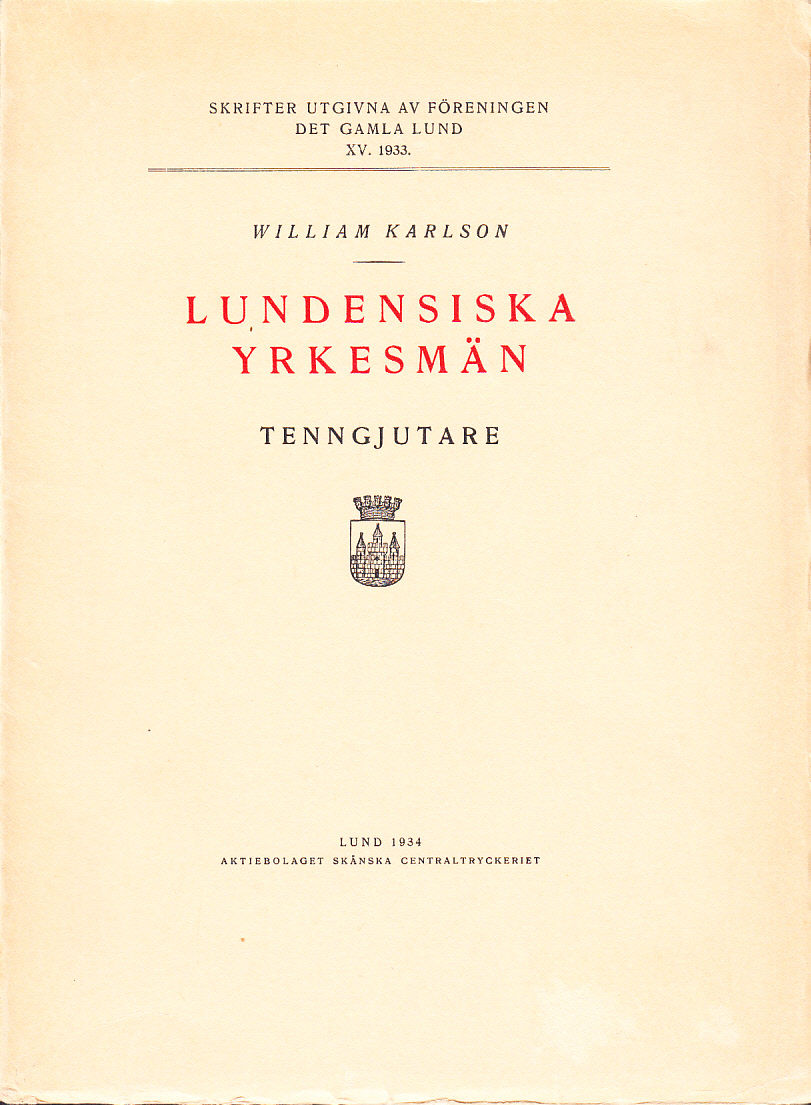 Skrifter utgivna av Föreningen Det gamla Lund 15. Innehåll: Inledning; Biografica (Måns Rasmusen, Anders Lindh, Håkan Andersson & Johan Falck; Josef Castellani & Jakob Matazzo; Hans Crohn; Christian Friedrich Baldthoff; Nils Georg Nordstrand; Jöns Möller; Olof Wahlgren; Josua Berglund; Johan Fredrik Werrenrath); Produktion; Tenngjutare i Lund (kronologisk förteckning); Bilagor.