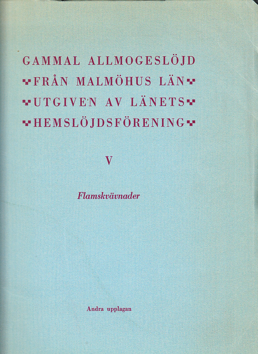 Andra upplagan. Färgplanscherna tryckta på bättre papper. Gammal allmogeslöjd från Malmöhus län. Utgiven av länets Hemslöjdsförening. V. Flamskvävnader.
