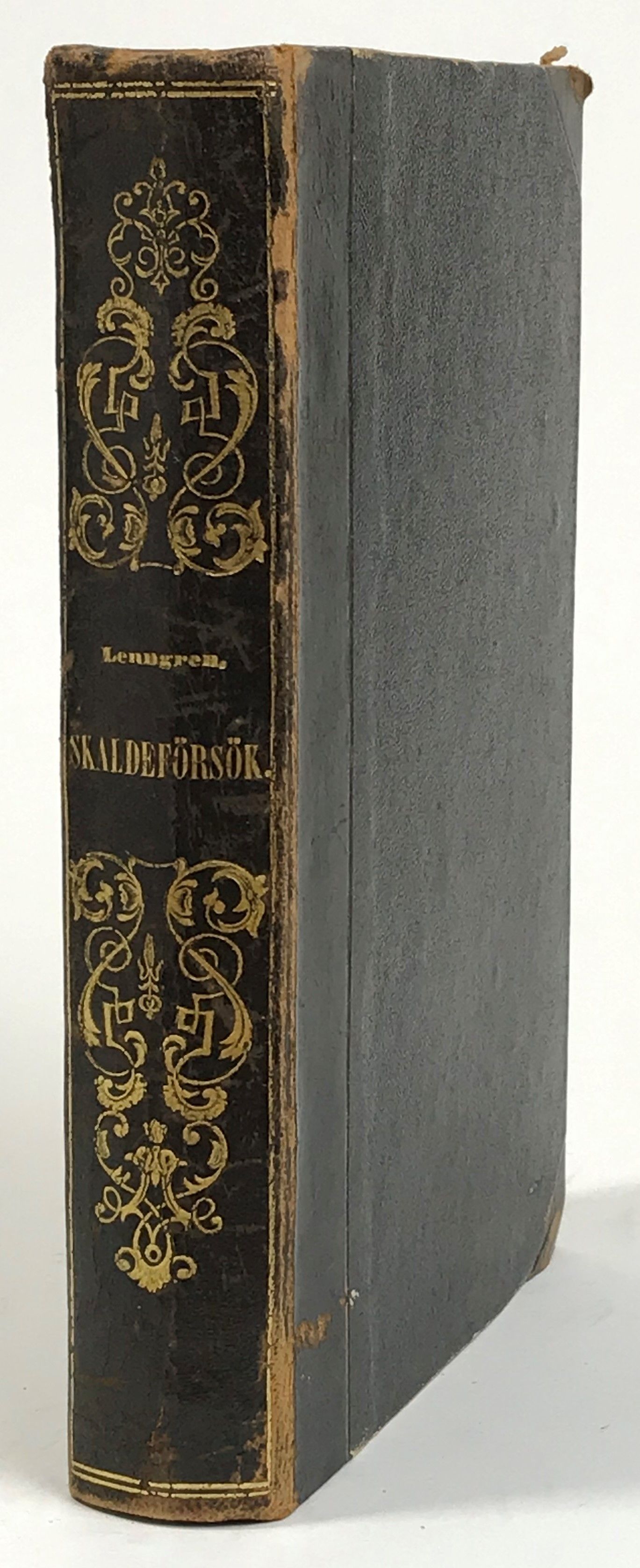 Stockholm, tryckt hos Isaac Marcus, 1857. 8:o. Frontespis, xxiv, (7), 390 s., (1 blankt) bl., 76 s., (14) pl.-bl. Illustrerad. Svart något nött halvskinnband med ryggtitel samt riklig ryggdekor i guld, svart pärmpapper. Nötta främre yttre hörn. Rygghuvud med spricka vid bakre yttre fals (ca 25 mm). Enstaka lagerfläckar förekommer. Namnteckning ‘Olof Petersson’ på försättsbladet. Ur Gunnar Carlquists bibliotek.